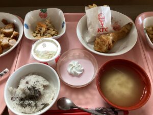 S主任が事前に予約してくれ、昼前にテイクアウトしに行ってくれたKFCがランチのお膳に並びました。