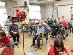 ご利用者様と職員で、カゴを目がけての玉入れ!