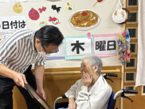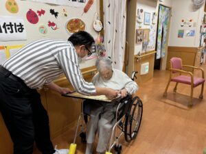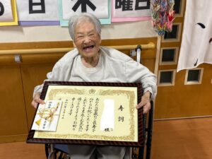 富士宮市長から、大きな表彰状と、これまた市から祝長寿のお祝い金が届き、施設長の代読により授与されました。