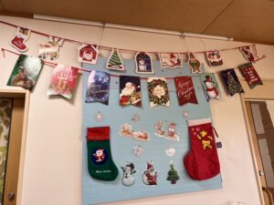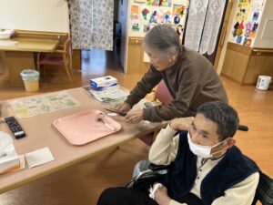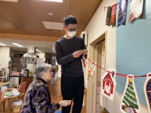 特養CDユニットで、H主任がクリスマスの装飾に精を出していると、F子さんがお手伝いを買ってでてくれました!
