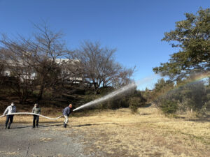 どんど焼き前には、消防ホースで水撒きを行い、延焼対策も念入りに行いました。